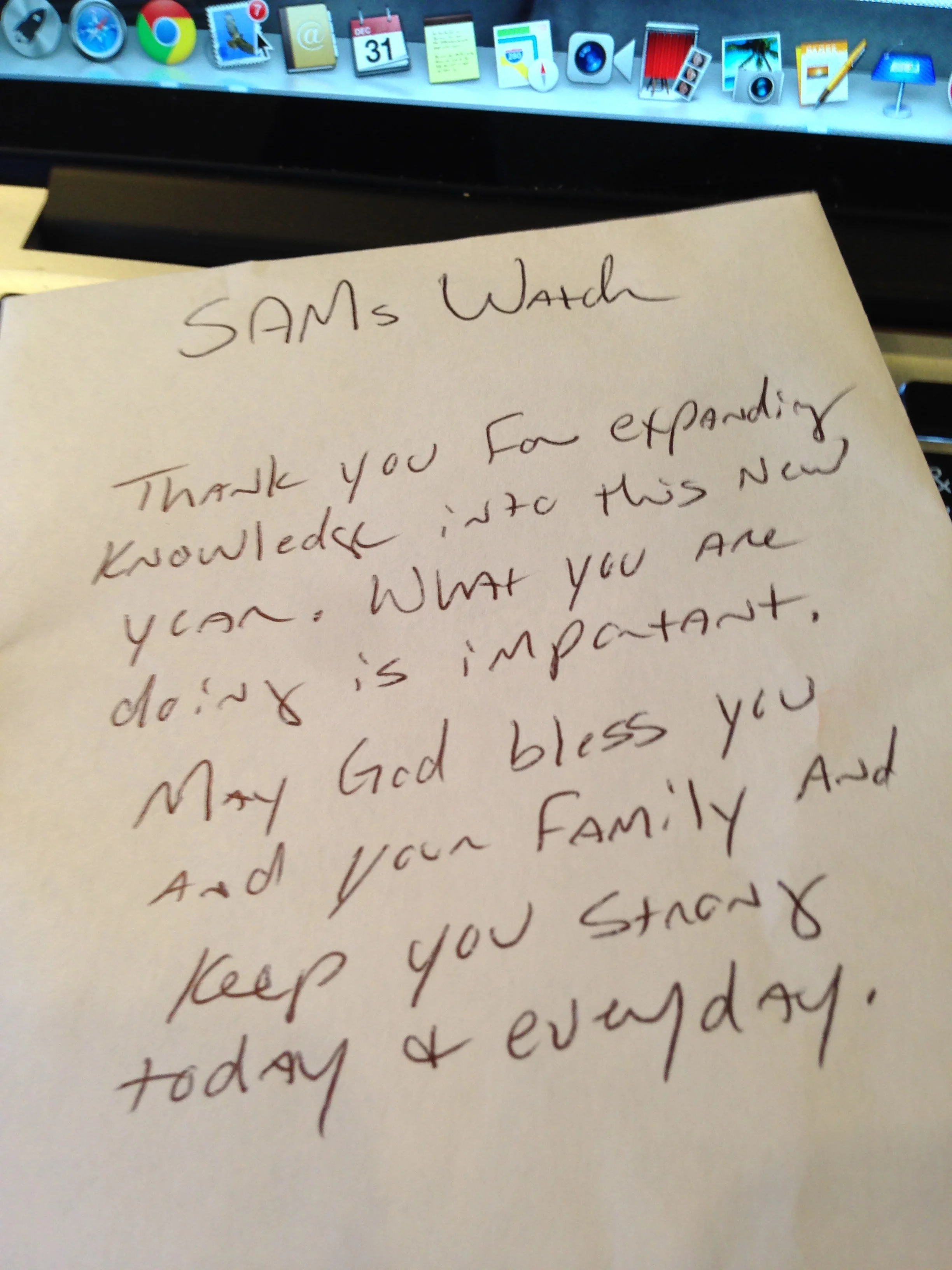 As I entered the Sam's Watch office this morning, an envelope had been slid under the door overnight. As I picked the envelope up and noticed writing on it, I began reading. I had no idea what would be written there for me to read would be so heartfelt. So as I read the thoughtful, handwritten words on the envelope, I cried. I was blessed by kindness. When I peeked inside the envelope, I was overwhelmed with thankfulness. To whomever the generous soul was that left this for me this morning, I cannot thank you enough in words... you touched my heart, and our lives, and we are blessed. Thank you, thank you, thank you. And now we move forward into 2015 bringing Sam with us and all our many, many blessings... Much love to Sam...